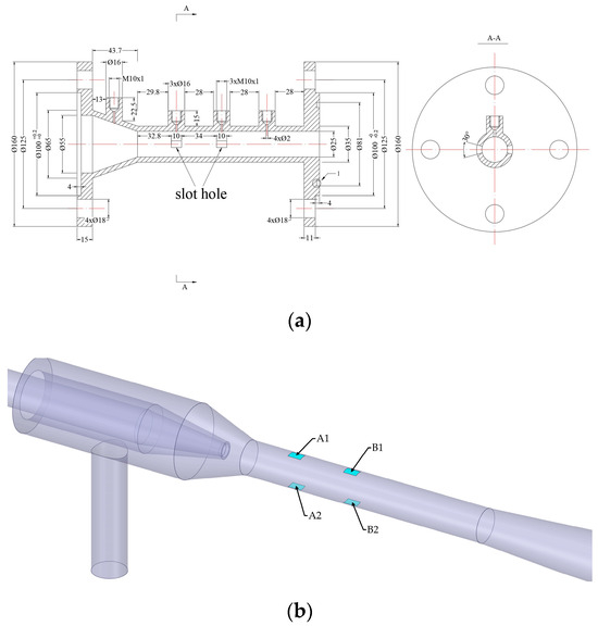 Jet pump particle wear experiments require testing the wear on the pipe wall and sampling. Existing studies often use methods such as installing internal pipe wall inserts or cutting the pipe after the test, which either affect the internal flow field or incur high costs. This study used a structural design that incorporates slots in the pipe wall, allowing for the replacement of inserts at the slot positions to test material wear. This approach avoids altering the flow field and reduces the cost of multiple pipe modifications. In the wear experiments, slots were made in the jet pump wall to accommodate the inserts that simulate the pipe wall, allowing for particle wear testing. The slots were cut at an angle along the main axis of the jet pump, with a length of 10 mm. The location and cross section of the slot in the mixing chamber and the names of the monitoring surfaces are shown in Figure 2.
