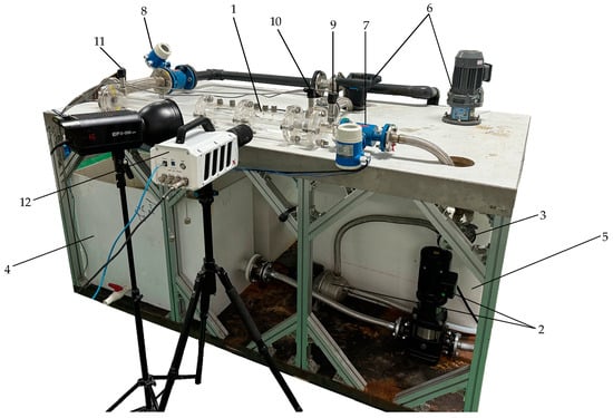 Experimental platform. 1—transparent jet pump; 2—power pump; 3—valve; 4—clean water tank; 5—sand-filled water tank; 6—stirrer; 7—inlet flow meter; 8—outlet flow meter; 9—inlet pressure sensor; 10—suction pressure sensor; 11—outlet pressure sensor; 12—high-speed camera.