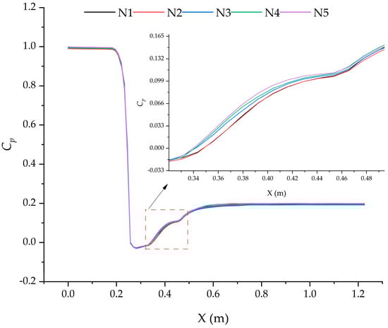 Figure 4 shows the variation curves of the centerline pressure coefficient (Cp) under different mesh schemes. The definition of Cp is as follows: