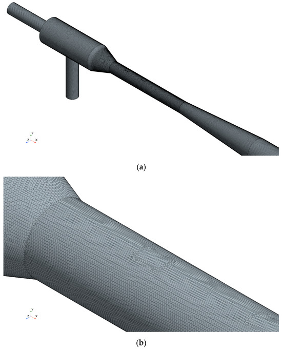 The commercial software used in this study is STAR-CCM+ 2302 (18.02.008-R8). In this study, the numerical simulation domain was the three-dimensional fluid domain of the jet pump, with the computational model and geometric parameters consistent with the experimental setup. A polyhedral mesh was used to discretize the computational domain. To ensure accuracy near the wall, finer mesh refinement was applied in the boundary layer, maintaining the y+ value of the near-wall mesh between 1 and 40. Given the high velocity gradients at the nozzle outlet and the throat regions, the mesh was further refined in these areas.