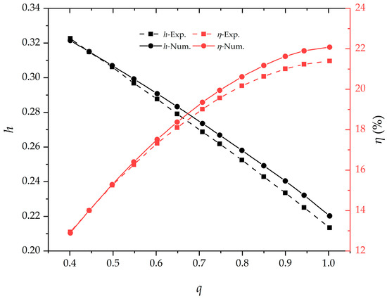 As shown in Figure 6, the numerical simulation results were in good agreement with the experimental data. Except for the case of q = 0.4, the experimental performance was generally slightly lower than the simulation results. This discrepancy can be attributed to two main reasons: (1) in the experiment, energy losses occurred due to friction on the jet pump wall, while wall roughness was not considered in the simulation; (2) there may have been dimensional deviations between the experimental model and the theoretical design, and possible misalignment or steps at the joints during assembly, resulting in some energy loss. According to the data in Table 6, although the error increased slightly with the flow rate ratio, the maximum error was only 3.2%, which is within an acceptable range. Therefore, the numerical simulation results were consistent with the actual conditions and exhibited high accuracy.