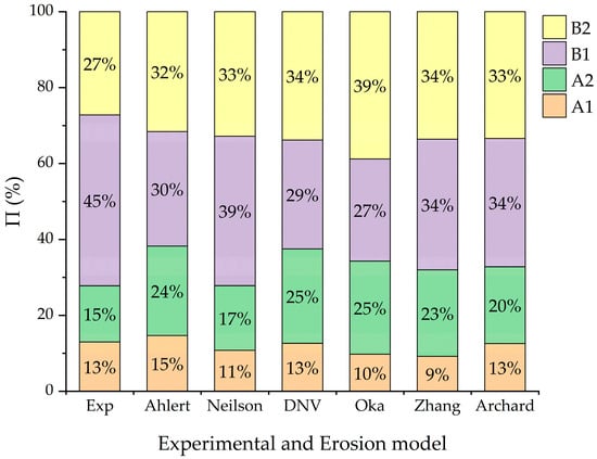 As shown in Figure 7, although there were some differences between the erosion models and between the models and the experimental results, the overall trends remained consistent. Specifically, at monitoring surfaces A2 and B2, the simulated erosion ratios were generally higher than the experimental results. In contrast, at monitoring surface B1, the simulated erosion ratios were lower than the experimental observations.