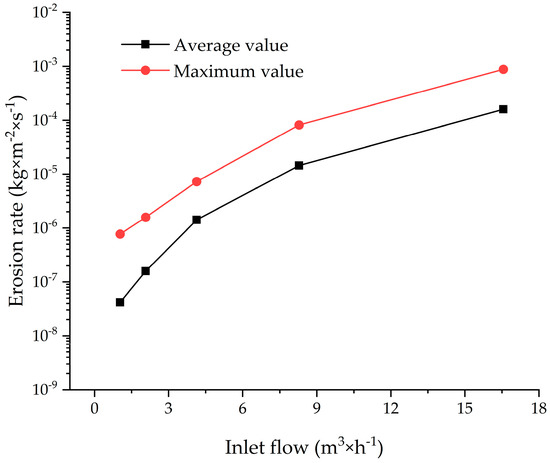 Figure 8 illustrates the impact of the inlet flow rate on the erosion rate. As the flow rate increased, both the maximum and average erosion rates showed an overall upward trend, exhibiting certain nonlinear characteristics. In the low-flow range (0–4 m3/h), the slopes of both of the curves were steeper, indicating that the increase in inlet flow rate significantly intensified the erosion rate. This is because at lower flow rates, the fluid cannot provide sufficient drag to overcome gravity, causing a large number of particles to deposit at the bottom of the throat, primarily sliding or rolling along the wall due to fluid shear force, resulting in sliding wear. With a further increase in flow rate (4–16 m3/h), the flow velocity rose, and the drag force strengthened, causing the particles to detach from the deposit and become suspended in the fluid. In this phase, particles collided with the wall at higher speeds and in irregular patterns, leading to intensified erosion wear.
