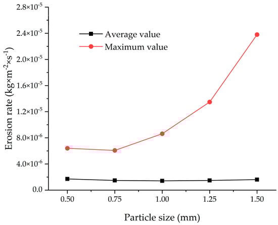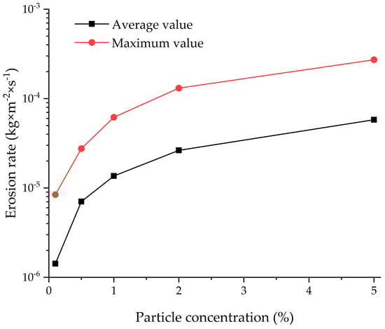 As shown in Figure 11, the particle volume fraction has a significant effect on the erosion rate. It can be observed that, with increasing particle concentration, both the maximum and average erosion rates rose, but the growth rate slowed down once the concentration exceeded 1%. This is mainly because, at high concentrations, particle collisions and interactions become more prominent. The phenomena of particle clustering or aggregation reduced the frequency of direct impacts on the wall, while the collisions between the particles consumed part of their kinetic energy, thereby reducing the impact force on the wall. Additionally, at higher concentrations, some particles may accumulate on the wall, forming a “protective layer” that cushions subsequent impacts, reducing the overall rate of increase in erosion. Consequently, as the particle concentration continues to increase, the erosion rate tends to stabilize. The essence of this phenomenon is similar to the conclusions drawn by Zhao et al. [12], where an increase in the particle accumulation near the wall forms a buffer layer, leading to a reduction in erosion. Additionally, it is important to note that, unlike Zhao’s study, the increase in particle quantity in this study was due to a significant change in the particle volume concentration, rather than a change in the particle size leading to a variation in the number of particles.