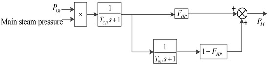 Simplified transfer function model of turbine prime mover. Where is the reaction time constant of the blade; is the set value of power; is the reference power.