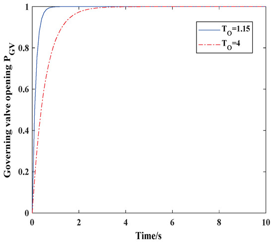 From Figure 3, when increases from 1.15 to 4, the PGV(t) curve changes greatly. It can be seen that the oil motor opening time constant has a great influence on the characteristics of the steam turbine, and this parameter needs to be considered in the equivalent modeling.