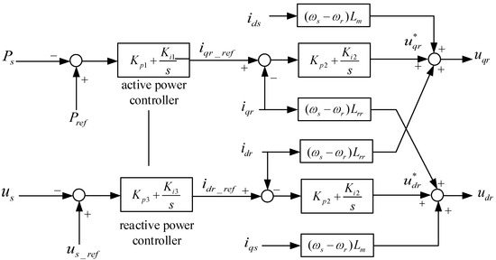 In the equation, is the reaction time constant of the blade; is the inductance of the rotor winding; is the mutual inductance between the stator and the rotor; is the electrical angular velocity of the stator. and are the proportional and integral coefficients of active power control; and are the proportional and integral coefficients of rotor-side current control; and are the proportional and integral coefficients of reactive power control.