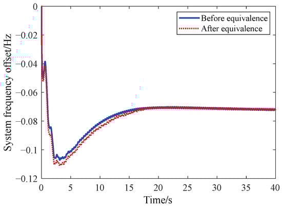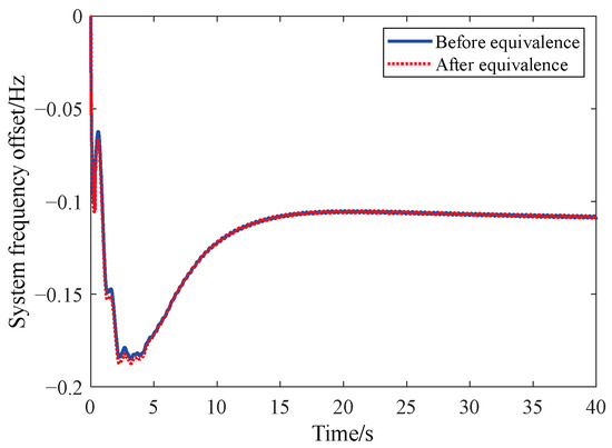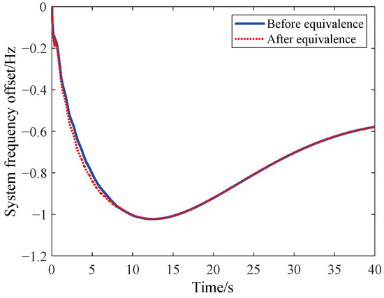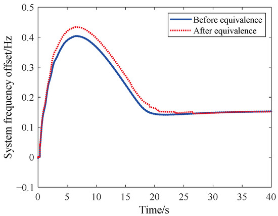 It can be seen from Figure 7, Figure 8 and Figure 9 that under the three DC blocking conditions, the frequency changes of East China Power Grid with and without equivalence are consistent, which proves that the equivalence method has a good equivalence effect. And as shown in Figure 10, under the simulated load of −7200 MW, which is a high-frequency fault, the frequency difference of the whole network of the East China Power grid with and without equivalent is no more than 0.03 Hz, which shows that the overall equivalent effect of this equivalent method is good. It can be seen that the equivalent method of the governor-prime mover and load based on regulation performance weighting proposed in this paper has good effectiveness under small power shortage, high power shortage, low-frequency fault or high-frequency fault and can adapt to the frequency dynamic analysis of large power grid.