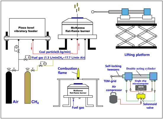 In this study, two kinds of Shenhua coal with different grain sizes were employed: coal with a grain size of smaller than 150 μm and coal particles with a grain size between 6 and 8 mm, which were named as sample #1 and sample #2, respectively. The two samples were burned in the form of a pulverized coal flow and a single particle, respectively, as shown in Figure 1. The devices for both combustion experiments consist of two parts: the flame generation part and the soot collection part. The pulverized coal flow combustion of sample #1 was carried out using a McKenna flat flame burner [26], as shown in the upper center part of Figure 1: the fuel was supplied through the central tube through a powder feeder at a rate of 0.3 g/min and ignited by a high-temperature exhaust gas, which was generated by the combustion of 1.3 L/min of methane in 17.7 L/min of air. The single-particle combustion of sample #2 was also conducted on the McKenna flat-flame burner, as shown in the lower center part of Figure 1: the sample was placed directly on the shelf above the burner and ignited by the high-temperature methane exhaust gas under the same conditions. The soot collection system utilizes a thermophoresis sampling apparatus, which is integrated on the lateral side of the McKenna burner. Detailed information regarding its composition and structural design can be found in the lower right section of Figure 1.