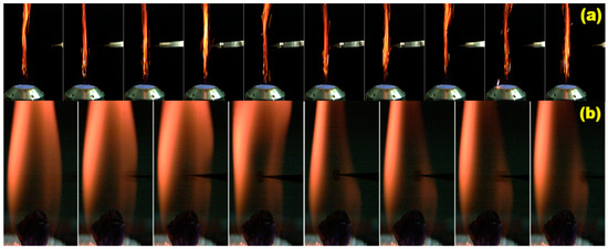 The thermophoresis sampling device is mainly composed of a pneumatic system, control circuit, sampling probe, and high-speed camera. The thermophoresis sampling device is installed on the electric translation platform to control the sampling height. The residence time of the TEM copper mesh in the flame is controlled by a single chip microcomputer. In order to confirm the position of the TEM copper mesh entering the flame and to ascertain the sampling time (residence time), a high-speed camera, FASTCAM Mini-UX50, was employed to document the complete thermophoresis sampling procedure [27], and the results are depicted in Figure 2. For stable simple hydrocarbon combustion flames, it is usually recommended that the thermophoresis sampling time for soot collection be approximately 23–65 ms [17]. However, for solid fuels such as coal, their combustion flames are chaotic and slender. Therefore, we have extended the thermophoresis sampling time to 100 ms in order to effectively collect soot samples for further morphology observation and analysis. Nascent soot and mature soot were collected to explore the effect of coal grain size on soot morphology during different combustion stages. The nascent soot was collected from the base of the combustion flame, while the mature soot was gathered from the middle and upper sections of the combustion flame.