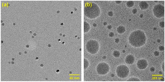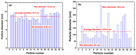 Figure 3 shows TEM pictures of nascent soot collected from the combustion flame roots of the two different grain sizes of coal. As shown in Figure 3, the nascent soot produced during the burning process of small-sized coal (sample #1) is composed of relatively uniform individual particles, whereas that produced in the combustion flame of large-sized coal (sample 2) is individual particles of uneven sizes. In addition, Figure 4 presents the statistical results of the grain size of nascent soot particles for further quantitative analysis. It can be observed that the grain size distribution of nascent soot produced by sample #1 is in the range of 8–14 nm, exhibiting an average grain size of 10.4 nm. In comparison, the nascent soot particles generated in the combustion flame of sample #2 are much larger than those generated in the combustion flame of sample #1. Furthermore, the size distribution range of soot in sample #2 is relatively wide, approximately 50–350 nm, with an average grain size of 123.9 nm.