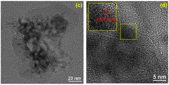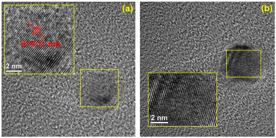 Figure 5 shows the HRTEM image of the nascent soot. It can be observed that the crystal structure is mainly composed of straight crystal stripes running parallel to each other. But the soot formed by sample #1 has an obvious crystalline stripe structure, while no obvious crystal structure was observed in sample #2. As shown in Figure 5d, only a small number of microcrystalline structures are found in soot particles formed by sample #2, and these microcrystalline structures mainly appear at the edge of particles. This is because the grain size of sample #2 is larger, the volatiles release is slower, and the combustion temperature is lower, resulting in an insufficient reaction of volatiles during the soot formation process. This makes the soot particles mostly incompletely reacted substances, and so no microcrystalline stripe structure was observed. This makes the formed soot particles mainly consist of incompletely reacted substances, so that the microcrystalline stripe structure is not observed. Furthermore, the intergranular distances between the crystal stripes in the two types of nascent soot particles were calculated. The intergranular distance of sample #1 (1.1 A) is smaller than that of sample #2 (1.5 A), signifying that the crystal structure of nascent soot particles produced in the combustion flame of coal became more condensed with the decrease in grain size.