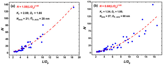 where N denotes the count of nascent particles in each aggregate; L represents the maximum projection length; Dp is the average diameter of primary particle; KL represents the correlation factor, which can be calculated by Equation (2); and Df is the fractal dimension.