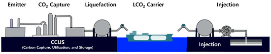 At the injection sites, the LCO2 is permanently stored underground in geological formations, such as depleted oil and gas fields or saline aquifers, ensuring secure and long-term storage. This process not only supports the sequestration of CO2 but also helps mitigate the impacts of climate change [19]. The coordinated operation of the entire system—including the emitter sites, capture facilities, LCO2Cs, and injection terminals—is essential for the efficient and seamless functioning of the CCUS process and ensures the reliable capture, transport, and storage of CO2 [20]. This integration ensures that CO2 emissions are effectively reduced and thus contributes to global efforts to combat climate change. Figure 1 illustrates the organic and interconnected operation of the CCUS value chain.