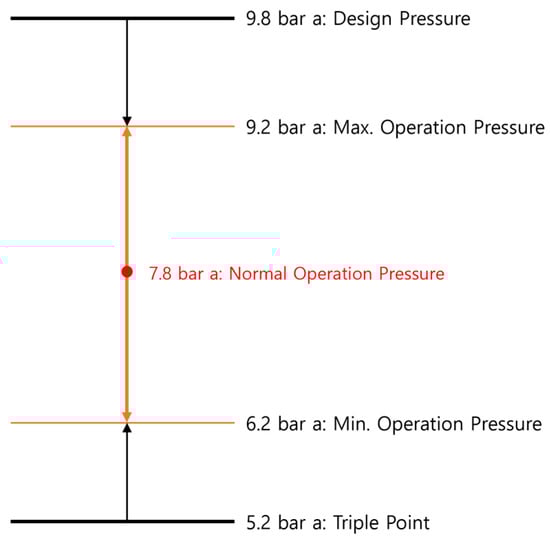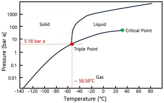 However, it is not without drawbacks. The storage temperature drops significantly compared with medium-pressure storage, which is typically around −46 to 50 °C [26,27,28]. Furthermore, the operating pressure approaches 7.8 bar a, while the triple point of CO2 occurs at 5.18 bar a. Comprehensive details on the triple point of CO2 are provided in Figure 3.