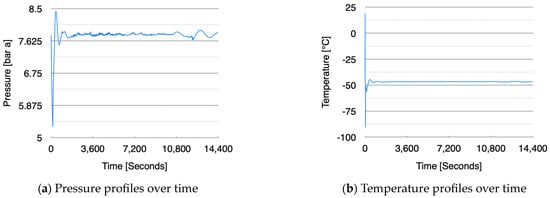 - Case B: This configuration maintained a steady flow and stable pressure without approaching the triple point and thus prevented the formation of dry ice. This stability makes it a more reliable and safer choice for LCO2 cargo loading, especially given the safety concerns associated with CO2 handling under low-pressure conditions. The target was to load up to 2.25 m3 within approximately 5 h, and this configuration showed results that closely matched this objective. The similarity between the simulation results and actual experimental data further validates this control method.