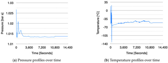 During the initial loading phase, there were significant fluctuations in pressure, accompanied by an increase in the amount of vapor vented to the atmosphere, leading to unstable pressure variations. From a heat perspective, the temperature dropped to as low as −73.10 °C, falling below the triple point for an extended period. This suggests a high likelihood of freezing occurring at the vapor discharge point, highlighting the need for pressurization to ensure stable cargo loading. In Case A, despite starting under less favorable conditions—such as opening the valve from a 0% opening ratio—this issue of the temperature dropping below the triple point did not occur, making it an important consideration for the current cargo handling procedure in Case C. Figure 12 presents the corresponding pressure and temperature profiles during this phase and illustrates these fluctuations.