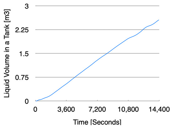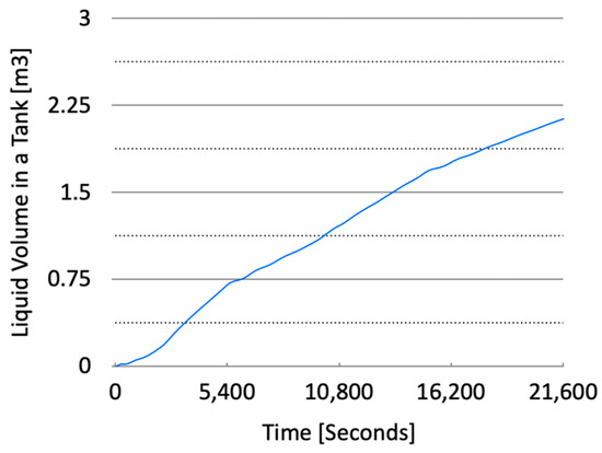 As vapor was stably vented into the atmosphere, the volume of LCO2 accumulated in the cargo tank increased steadily, following a linear pattern. While the loading process was slower than in Case A, the inflow rate closely matched the planned rate of 0.5 m3 per hour, accounting for the amount vented. After five hours of loading, the volume in the tank reached 2.25 m3, which was consistent with the initial loading plan. Figure 10 presents these observations and highlights the stable accumulation of LCO2 during the loading process.