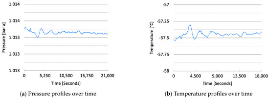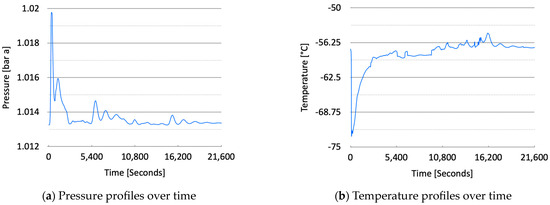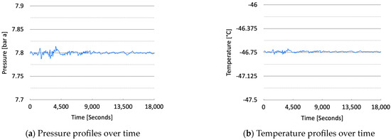 The loading process proceeded smoothly, and it was confirmed that the pressure released to the atmosphere remained stable, with a consistent flow rate. During the initial loading phase, there were no significant pressure differences, although the initial release of CO2 vapor caused a slight increase in pressure. However, after more than two hours, the pressure stabilized with minimal fluctuations. Similarly, the temperature inside the cargo tank remained steady throughout the process, with almost no variation, confirming stable conditions within the tank. Figure 9 presents the temperature and pressure of the vapor released into the atmosphere.