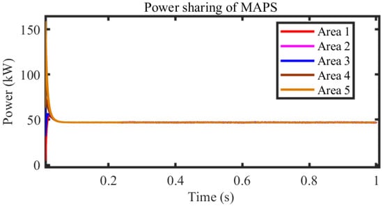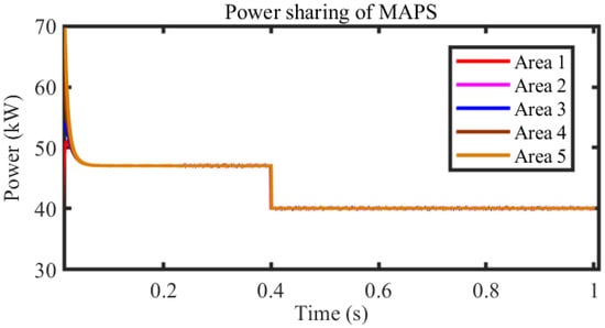 Figure 5 illustrates the power-sharing response of the proposed resilient consensus control mechanism for equal power sharing in a MAPS under root area attacks. The figure demonstrates that while the power-sharing response exhibits some compromised regulation performance and minor ripples due to the presence of FDI attacks, the system remains largely effective. Specifically, Figure 5 shows that the equal power-sharing state is temporarily affected from approximately t = 0.09 s to t = 0.15 s. Despite these temporary disturbances, the the MAPS achieves a stable equal power-sharing state shortly after the transient period. This behavior aligns with Theorems 2–4 and Case 3, which confirm that the proposed scheme is sufficiently resilient to root area attacks, ensuring that the the MAPS returns to and maintains equal power sharing effectively.