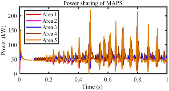 This case focuses on the equal power sharing of the MAPS with the FDI attack, as expressed in (12). In this case, the coordination of different areas in the MAPS is affected by FDI attacks by injecting noise or random signals. Also, the existence of communication delay due to FDI attacks results in a latency of power information sharing between the MGs. As a result, there will be no coordinated power-sharing information, and this can cause the MAPS to fail to achieve an equal power-sharing state.