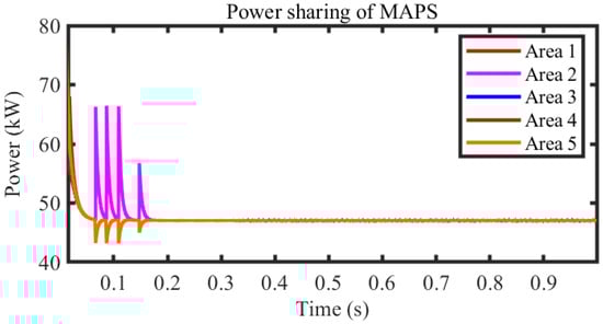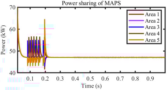 Figure 6 depicts the response of the equal power-sharing state of the MAPS under a non-root node attack. According to Theorems 2–4 and Case 4, the MAPS is expected to maintain an equal power-sharing state despite the presence of these attacks. However, Figure 6 illustrates that non-root area attacks disrupt the flow of measurement power information between the areas of MAPSs, leading to significant deviations in the equal power-sharing state. Specifically, the figure shows fluctuations in the power-sharing response from approximately t = 0.09 s to t = 0.20 s, indicating the impact of the attacks. These observations underscore the importance of the proposed controller, as discussed in Theorems 2–4. The proposed consensus control technique effectively balances security measures with power-sharing requirements, demonstrating its capability to maintain equal power sharing across the MAPS even in non-root area attack scenarios.