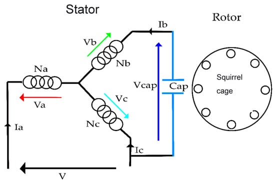 The asymmetric machine follows the same line as the conventional symmetric motor, with changes being made only to the number of turns per phase, as proposed by [11,12]. Under these conditions the machine can be powered by a single-phase voltage system, as seen in [13,14] for the Y connection which for the Y connection is indicated in Figure 1. Note the presence of an additional capacitor between terminals “b” and “c”, which holds the purpose of solving the machine’s starting problem, as well as improving performance in the nominal steady-state condition.