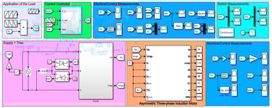 To improve the accuracy of the theoretical calculation of the electromagnetic torque, time-domain modeling incorporates the spatial harmonics of the magnetic field that originate from the machine windings. In this approach, as proposed by [8,9], these elements are considered through the concept of harmonic inductances. According to [10], the asymmetric three-phase induction motor has a squirrel cage rotor and ferromagnetic stator structure identical to that of the symmetric three-phase induction motor, with only a change in the stator winding, which has different numbers of turns per phase, maintaining the angular displacements between phases of 120°.