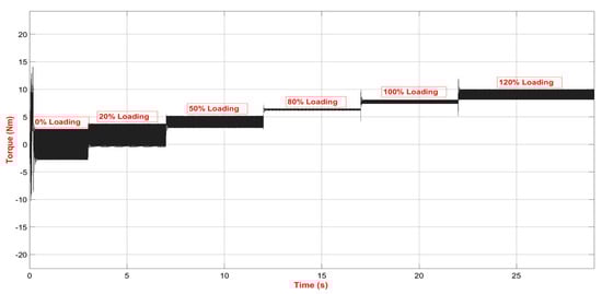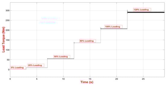 In Figure 4, the variation in the load torque is shown. Step loads were applied to the machine shaft, with values ranging from 0% to 20%, 50%, 80%, 100%, and 120% of the nominal load.