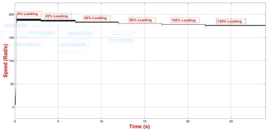 In Figure 5, the motor speed can be observed with step loads of 0%, 20%, 50%, 80%, 100%, and 120%. The speed values are in radians per second (rad/s), and these values can be seen in Table 2.