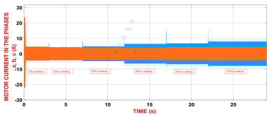 After imposing these load percentages, the currents in phases “a”, “b”, and “c” reach the steady-state values shown in Table 3.