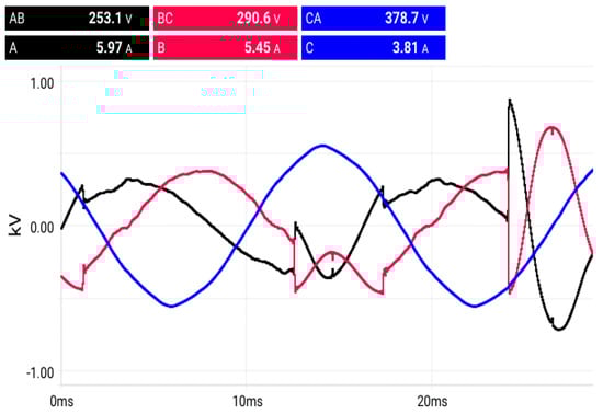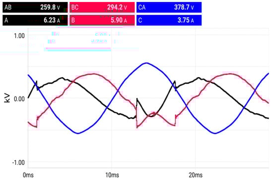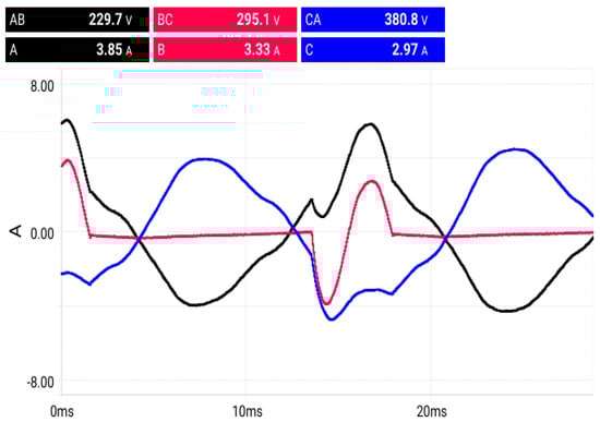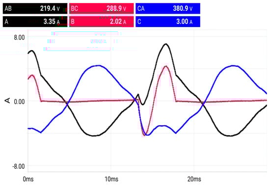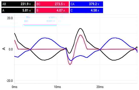 It was observed that, with a 100% load, as shown in Figure 15, there were steady-state currents of 3.85 A, 3.33 A, and 2.97 A. This indicates that the electrical current values stabilized and remained constant during the continuous operation of the system under this specific load condition.