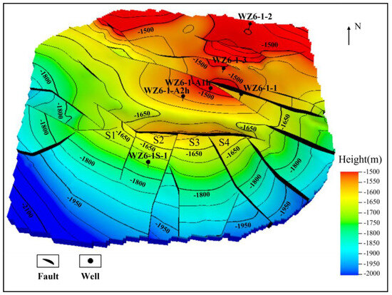 As shown in Figure 1, the WZ6-1 oil-bearing structure in the Beibu Gulf Basin of the South China Sea is an anticline complicated by faults, divided by two nearly east–west trending faults into three regions: the northern block, central block, and southern block. The southern block is segmented by several near north–south trending radial faults into four fault blocks of varying sizes, named S1, S2, S3, and S4 from west to east. The primary target reservoir layer is the W3IV oil formation of the Oligocene Weizhou Group, consisting of interbedded sandstone and mudstone deposited in a fan delta front environment. The W3IV reservoir has favorable properties, with an average porosity of 26% and permeability of 1120 × 10−3 μm2. This structure is highly faulted, with uncertain fault-sealing properties, leading to a complex and variable distribution of oil, gas, and water, and limited understanding of the hydrocarbon accumulation patterns. Five wells were drilled in the northern and central blocks, located at higher structural positions, but they were unsuccessful, with no oil-bearing layers encountered. After further evaluation, an exploratory well, WZ6-1S-1, was drilled in the lower structural position in the southern block, specifically in the S2 fault block, which resulted in a successful oil discovery.