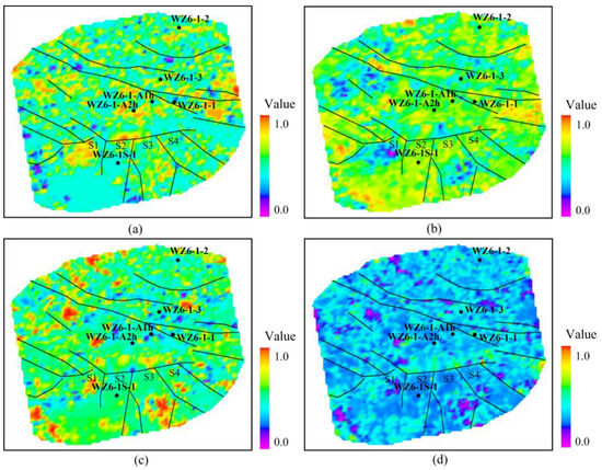 After oil was confirmed through drilling in the S2 fault block in the lower structural position of the southern block, discussions were raised about whether the adjacent fault blocks, S1, S3, and S4, might also contain oil, given their similar geological conditions to S2. To assess the oil-bearing potential of the three fault blocks adjacent to S2, six seismic attributes along the strata, closely associated with hydrocarbon presence, were selected based on previous studies and well–seismic response characteristics in this area. These attributes include arc length, root mean square (RMS) amplitude, dominant frequency, energy half-decay, bandwidth, and instantaneous phase, and are used to predict hydrocarbon-bearing zones based on seismic attributes. As shown in Figure 2, if traditional single seismic attribute methods are used for oil-bearing zone prediction, the results reveal that the spatial distribution of the six seismic attributes is chaotic, with no discernible pattern. Additionally, there is almost no difference in the seismic attribute characteristics between the five unsuccessful wells drilled at higher structural positions and the oil-bearing S2 fault block confirmed by drilling in the lower southern block (WZ6-1S-1). It is evident that the traditional single seismic attribute prediction method for oil-bearing zones is entirely ineffective in this area and cannot address whether the S1, S3, and S4 fault blocks adjacent to S2 contain oil.
