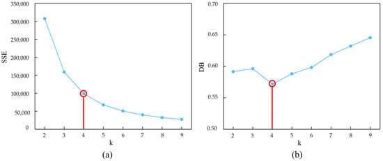 SSE elbow method and DB index method line chart. (a) SSE elbow method; (b) DB index method.