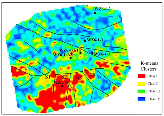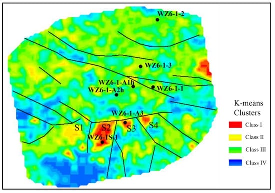 The results of the oil-bearing zone prediction using the SVD–K-means clustering method are shown in Figure 6, demonstrating good predictive performance: ① The southern S2 fault block, which has been confirmed as oil-bearing by the WZ6-1S-1 well, remains in the red oil-bearing zone (Class I). Compared to the K-means prediction result based directly on seismic attribute data (Figure 5), the red (Class I) oil-bearing area has significantly contracted towards the higher structural position of the S2 fault block trap, almost aligning with the S2 fault block’s trap area, which is consistent with hydrocarbon accumulation patterns. ② The locations of the five dry wells in the high structural positions (WZ6-1-1, WZ6-1-2, WZ6-1-3, WZ6-1-A1h, and WZ6-1-A2h) are all within the yellow (Class II) or green (Class III) regions. The prediction results are consistent with the drilling outcomes. ③ A rolling development well, WZ6-1-A3, was deployed in the high structural position of the S3 fault block within the red (Class I) region, yielding successful results: a total oil layer thickness of 15.8 m was encountered, and the production rate reached 150 m3/d after commissioning. ④ The high structural position of the S4 fault block in the southern block is also within the red (Class I) region, suggesting it as a potential target area for future exploration and development.