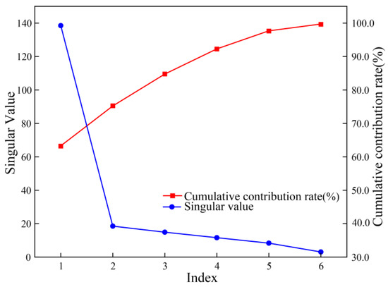 In Equation (5), U = {u1, u2,…, uN} is an N × N orthogonal matrix, V = {v1, v2,…,vM} is an M × M orthogonal matrix, and Σ is an N × M diagonal matrix with rank r ≤ min (N,M). The singular values σi, arranged in descending order along the diagonal of Σ, satisfy σ1 ≥ σ2 ≥ ⋯ ≥ σr. The matrices U and V can be derived from the eigenvectors of xxT and xTx, respectively. The singular value σi is the square root of the non-negative eigenvalues of xxT and xTx. A larger singular value represents a higher amount of information energy contained. The number of singular values to retain is determined based on the cumulative contribution rate of the singular values, controlling the amount of information retained [27,28]. This is calculated as follows: