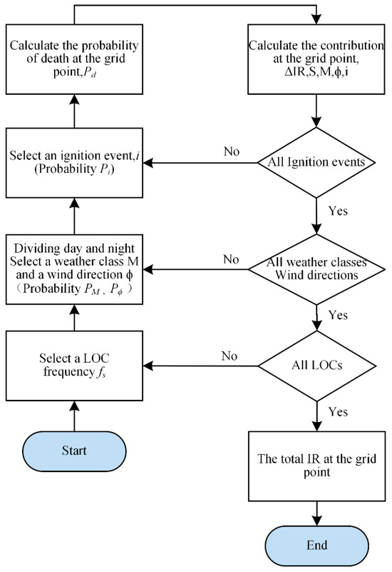 The methodology for determining individual risk at a grid point is outlined in Figure 1. It starts by selecting the frequency of a loss of containment (LOC) event (fs). After this, a weather class “M” and a wind direction “ϕ” are chosen, considering both day and night divisions, with conditional probabilities represented as PM and Pϕ. Once the weather and wind parameters are set, the next step is to select an ignition event, applicable only to flammable substances, with its conditional probability denoted as Pi. This step determines whether an ignition occurs, influencing the severity of the consequences. The iterative process continues by determining the contributions of various factors to the individual risk at the grid point, according to Equation (1). If all possible ignition events, weather classes, and wind directions have been considered, the contributions are summed to obtain the total individual risk at the grid point, according to Equation (2). The leakage probability of equipment and facilities is determined in accordance with GB/T37243-2019 (Determination method of external safety distance for hazardous chemicals production units and storage installations) [17], and SH/T 3226-2024 (Standard for quantitative analysis of petrochemical process risk) [18], which define leakage scenarios and frequencies. To determine the probability of ignition, AQ/T3046-2013 (Guidelines for quantitative risk assessment of chemical enterprises) [19] provides recommended values, and an appropriate reference value can be selected based on the requirements of the risk assessment method.