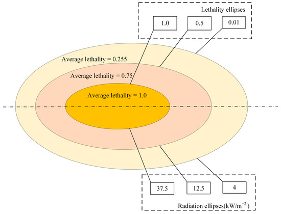 The individual lethality probability of a person exposed to thermal radiation is determined using different ellipses in Figure 2, each representing varying radiation intensities as calculated by DNV SAFETI (Version 9.0) [20]. The highest radiation intensity is observed in the central area, where the lethality reaches 1.0, indicating that almost all individuals within this zone will not survive. As the distance from the center increases, both radiation intensity and lethality decrease accordingly. Figure 2 shows that radiation intensity is greatest within the innermost ellipse, while outside the outermost ellipse, the radiation level drops to zero. Between these ellipses, the corresponding lethality probability is calculated through interpolation of the specific radiation intensities.