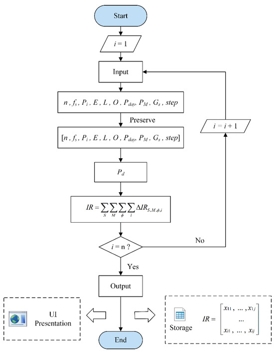 In conducting a risk assessment of an oil tank farm, the core of the risk calculation relies on a detailed consequence analysis of the accident scenario. As illustrated in Figure 4, this process requires the input of several key parameters (Refer to Appendix A, Table A1): failure frequency fs, immediate ignition probability Pi, thermal radiation and overpressure matrices (early pool fire thermal radiation matrix E, late pool fire thermal radiation matrix L, explosion overpressure matrix O), weather parameters including wind direction and daytime and nighttime wind frequency (Pday, Pnight), and mapping parameters such as grid size Gs and grid step. The system automatically integrates these inputs and executes a complex computational algorithm to generate an i × i matrix. This matrix simulates and quantifies the probability of fatal injuries to individuals at different locations under specific conditions, Pd, through iterative calculations, where each cell represents a risk state based on various factors such as leakage source location, wind direction, and wind speed. To visualize and present the calculation results, the program presents the user-input data in a tabular format and supports hierarchical data analysis, enabling the comparison of risks across different storage tanks. Additionally, the program generates statistical tables that are further analyzed using contour plots, providing a detailed assessment of individual risks at each grid point.