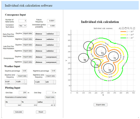The individual risk calculation process is articulated through a modular framework, implemented using MATLAB App Designer (MATLAB 2023b). The first module focuses on tank parameters, considering critical aspects such as pressure, temperature, and the nature of the substance stored. This module assesses the probability of fatality for individuals in the event of an accident, establishing a fundamental determinant of individual risk. Following this, the weather factors module introduces the probabilities of various meteorological conditions, examining their influence on the dispersion and consequences of accidents. For example, wind speed and direction can significantly affect how hazardous materials spread, impacting the risk zones for individuals. The final module, dedicated to plotting, creates contour maps that visually represent the risk levels in the vicinity of the tanks, where each contour line corresponds to a specific risk value. This visualization is essential for understanding how risk fluctuates with distance from the source. Ultimately, the main function synthesizes the results from these modules, culminating in a thorough assessment of individual risk. The entire application is designed with user interaction in mind, allowing for real-time data input and visual feedback through the MATLAB App Designer interface.