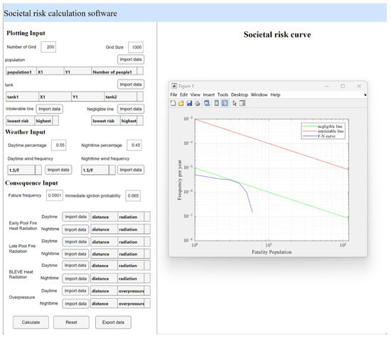 The user interface (UI), as shown in Figure 6 and Figure 7, consists of three input modules for collecting consequence parameters, weather conditions, and plotting preferences, respectively, along with a results display panel. The results panel intuitively presents individual risk contour plots and F-N curves, while also integrating a data export function. Additionally, it supports the simultaneous display of graphs and tables, meeting user needs for comprehensive analysis and reporting.