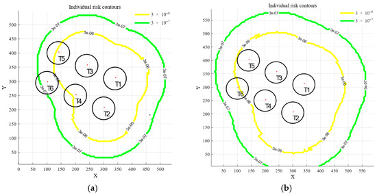 According to the Chinese Standard GB 36894-2018 (Risk criteria for hazardous chemicals production unit and storage installations) [27], Table 2 provides color-coded levels for individual risk contour plots to enhance clarity: the 3 × 10−5 contour is marked in red, indicating a higher risk zone; the 1 × 10−6 contour appears in orange for an intermediate risk level; and the 3 × 10−7 contour is displayed in yellow, indicating a lower risk zone. Areas with acceptable risks of below 3 × 10−7 are represented in green, providing a clear visual distinction between varying levels of risk.