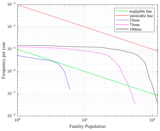 Figure 9 presents individual risk modeling results for two spill scenarios (corresponding to the first case in Figure 6). The 25 mm aperture scenario shows more frequent spills and higher individual risk peaks, though with a relatively limited range of spill consequences. Conversely, the 75 mm and 100 mm aperture leaks, with identical spill frequencies, exhibit a broader range of spill consequences but lower individual risk peaks, staying below the 1.0 × 10−5 contour level. Figure 10 shows the societal risk modeling outputs for the three spill scenarios, where despite the more frequent 25 mm hole diameters leaks, the overall social risk is smaller and in the ALARP zone due to the relatively smaller impacts of the spill consequences. In contrast, the 75 mm and 100 mm hole diameters leak scenarios have the same frequency of leaks and the societal risk is mostly in the ALARP zone with more similar risk results. However, larger leak apertures imply more severe consequences of the leaks, so that the maximum number of deaths for the 100 mm leak scenario reaches 120, which is more than double that for the 75 mm leak scenario, and the risk is also slightly higher overall.