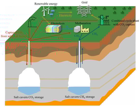 Concurrently, the role of natural gas in energy utilization continues to strengthen, with its recoverable reserves expanding through technological advancements. The increasing interconnection between power systems and natural gas systems has led to growing interest in dual-grid coupling research. A novel salt cavern electro-to-gas system has been proposed (shown in Figure 1), which can integrate renewable energy sources while facilitating limited carbon dioxide sequestration [12]. In this carbon cycle, renewable energy is used to produce hydrogen through water electrolysis, while captured CO2 from industrial plants participates in methanation and is stored in salt caverns. This method avoids new CO2 production and emission, presenting an effective carbon capture, utilization, and storage (CCUS) approach. Pilot plants for PtG are currently operational in several countries, including Germany, Switzerland, the USA, Canada, France, Denmark and Japan [3,13,14]. The principal reaction involved in PtG is the Sabatier reaction for water electrolysis and methanation. The type of geological CO2 storage includes salt caverns, depleted oil and gas reservoirs, basaltic rocks, deep saline aquifers, etc. [15]. According to Table 1, salt caverns are a good option that can be used to store CO2 permanently in areas where there are no other storage options, like Alberta and Saskatchewan in Canada, salt caverns built offshore in ultra-deep water in Brazil or other places where the salt deposits are high [12].