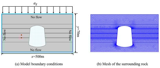 Two-dimensional geological model and mesh grid of the cavern. (a) Model boundary conditions, and (b) Mesh of the surrounding rock.