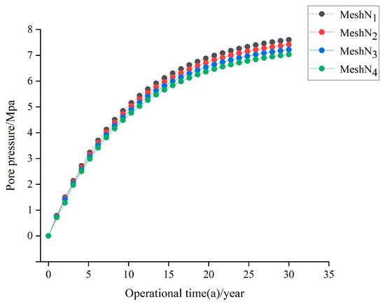 In general, the greater the density of the mesh, the more precise the resulting calculations will be. However, this also has the effect of considerably increasing the time required for the simulation. In order to enhance the calculation speed while simultaneously ensuring the precision of the simulation results, it is essential to conduct a verification of mesh independence. In the grid division, the primary choices for the largest grid size were N1max = 0.95 m, N2max = 0.85 m, N3max = 0.81 m, and N4max = 0.61 m, representing four distinct grid densities. The total numbers of grids were N1 = 5142, N2 = 7564, N3 = 9981, and N4 = 14,485, which were applied in a 12 MPa stratum pressure environment. The objective of the simulation is to ascertain the correlation between the average leakage size in the cavern and the operating pressure of 8 MPa. Figure 3 illustrates the impact of varying grid numbers on the fundamental CO2 seepage within the salt cavern.