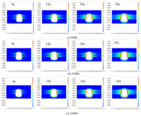 Figure 4 shows a contour plot of the pore pressure of CO2 in the salt cavern at different operating pressures. The permeation of CO2 through the cavern wall is primarily driven by the pressure gradient. When the pore pressure equals the initial pressure of the formation, the pressure gradient becomes zero, causing gas flow to cease. The distance of gas flow is considered the penetration range. Over time, CO2 will continue to infiltrate the formation, leading to an increase in the penetration range. Given that the porosity and permeability of the mudstone layer are higher than those of the salt layer (with the permeability of the mudstone layer at 1.0 × 10−18 m2 and that of the salt layer at 1.0 × 10−20 m2), Darcy’s law indicates that the flow rate of gas between layers is faster than that in salt rock. Therefore, the permeability range of the mudstone layer would be greater. The pressure propagation process can be divided into two phases: the extension of the CO2 impact range to the modelled boundary (operational time 30 a) is the first phase, and the extension of the CO2 impact range to the modelled boundary (operational time > 30 a) is the second phase. In the first phase, the CO2 transport rate is faster, the CO2 influence area gradually expands, the CO2 pressure within the influence area increases, and the transport rate and pressure increase gradually decrease with the extension of the sequestration time. In the second phase, the CO2 pressure has propagated to the simulation boundary, the CO2 pressure at the simulation boundary is increasing, the CO2 transport pressure difference decreases, the seepage effect of CO2 transport decreases, and the contribution of diffusion increases, resulting in a further decrease in the rate of CO2 transport and pressure increase, and tends to stabilize.