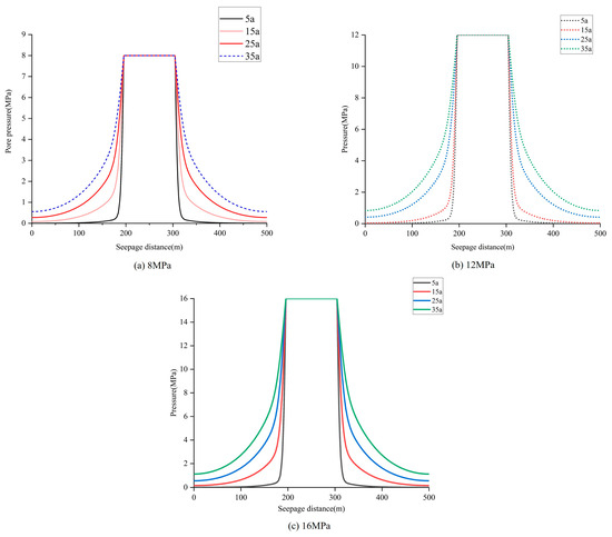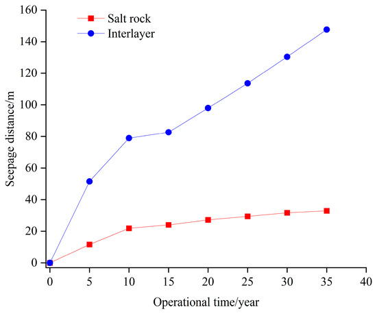 The storage pressure has no significant effect on the CO2 transportation rate and influence range within the salt rock layer. Figure 5 and Figure 6 illustrate the relationship between CO2 pore pressure and the distance. As the permeation distance increases, the pore pressure in the rock layers begins to decrease sharply before gradually leveling off until flow ceases. With an increase in operational time, the pore pressure in the rock layers exhibits similar behavior; however, the pressure drop curve eventually becomes linear, indicating a stable flow rate and steady state of seepage. The pressure drop curve trends from a rapid decline to a gradual plateau, resembling a concave curve. Compared to the interlayer, the pore pressure drop curve for the salt rock layer is steeper, with a greater slope and shorter permeation range. This is attributed to the lower permeability of salt rock, which results in higher resistance to gas permeation. Figure 7 shows the variation curves of CO2 seepage range in the interlayer and salt rock, from which it can be seen that the seepage range increases gradually with time and eventually also tends to stabilize; the permeability ranges of the interlayer and the salt rock layer in 30 years are 142.53 m and 31.99 m, respectively, and the permeability range of the interlayer is about 4.45 times as large as that of the salt rock layer.