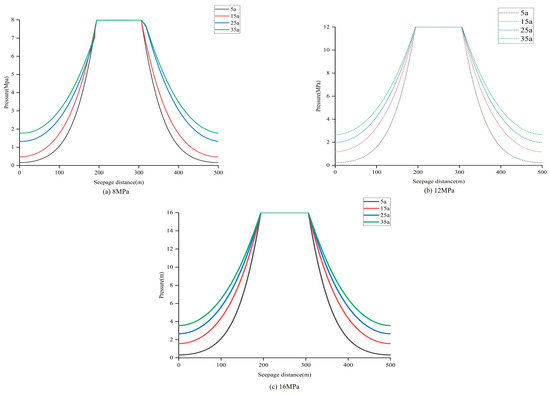 Evolution characteristics of CO2 pressure in interlayer at different storage times. (a) 8 MPa, (b) 12 MPa, (c) 16 MPa.